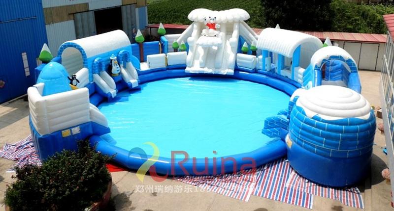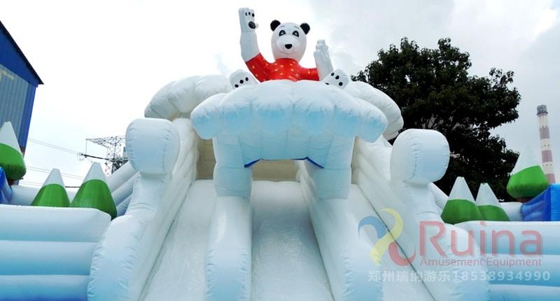 冰雪世界充氣城堡以小朋友喜愛的冰雪企鵝為主題元素,造型逼真,搭配上充氣水池使用,營造出了一個逼真的冰雪世界,非常討小孩子喜歡。該款充氣城堡搭配充氣泳池使用,滿足親自游玩的需求!再加上沖浪水滑梯和支架水池的結合,定會讓孩子有個開心的游玩經(jīng)驗