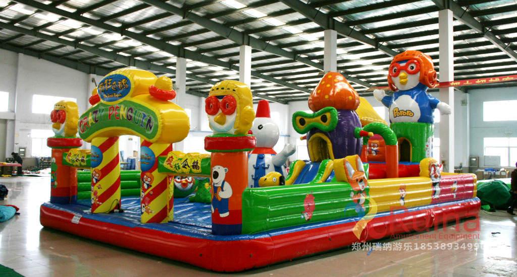 該款企鵝充氣城堡制作過程采用了下料、縫紉、熱合、粘整等工藝,適用于學校,娛樂城、游樂園、超市、大型商場等兒童聚集地。企鵝造型異常逼真,栩栩如生,能夠強烈吸引著孩子們前去玩耍。這款城堡玩法豐富,可以滑、蹦、鉆、跳等,娛樂無窮。